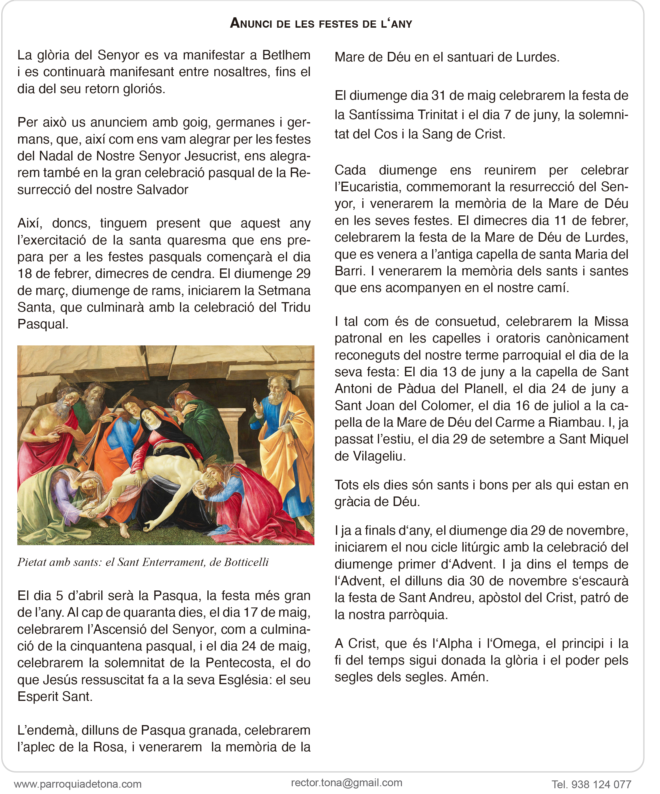 Durant els mesos de juliol i agost, no hi ha un horari d’atenció específica al despatx. En canvi, ens podeu trobar acabada la missa del matí a l’església.