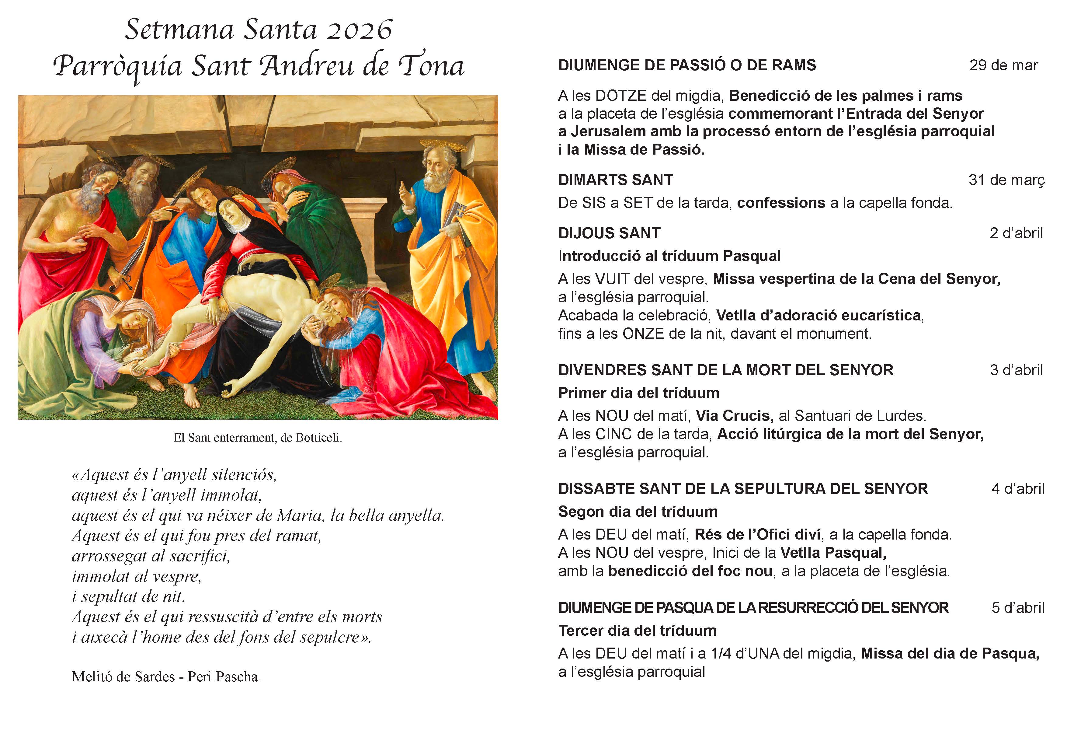 Dimarts, dimecres, i divendres Laudes i Missa, a les 9 del matí.